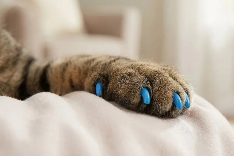 Image: A close-up of a cat’s paw with blue nail caps, a humane alternative to declawing.